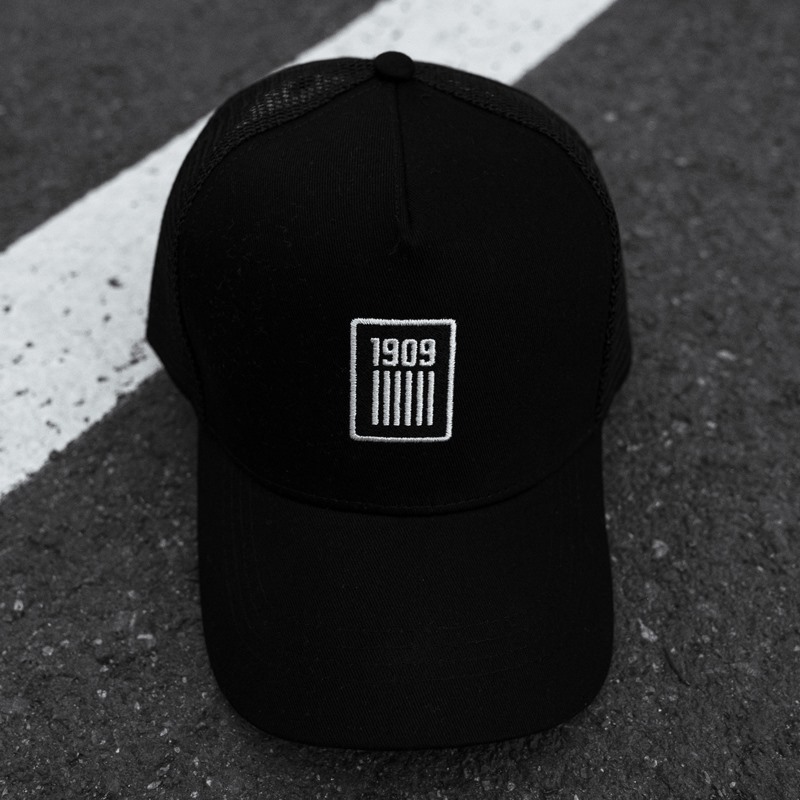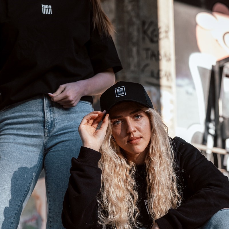 Trucker Cap mit gebogenem Schild, Mesh-Netz und Snapbackverschluss.