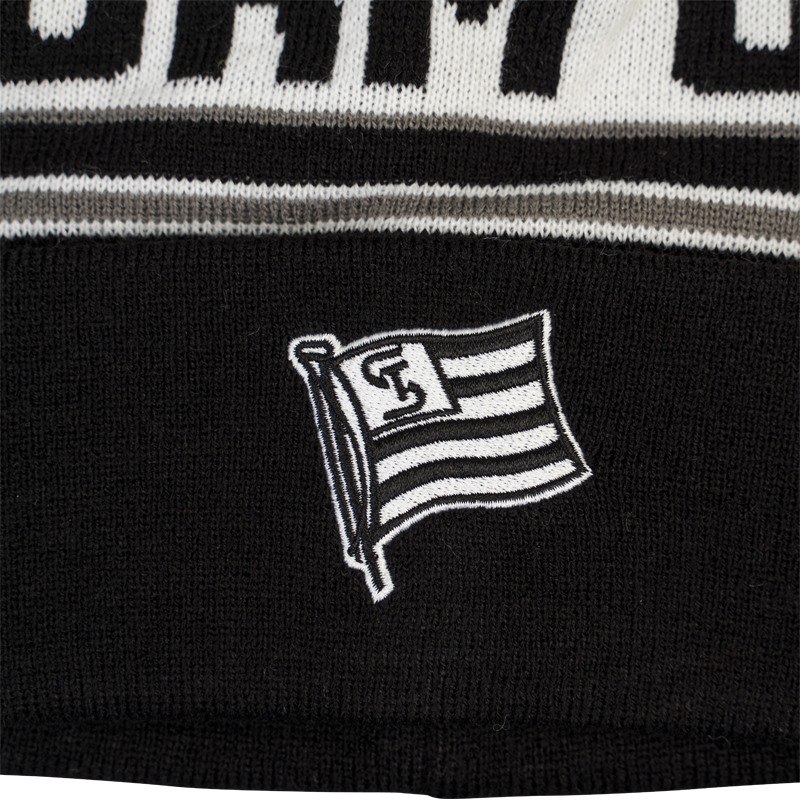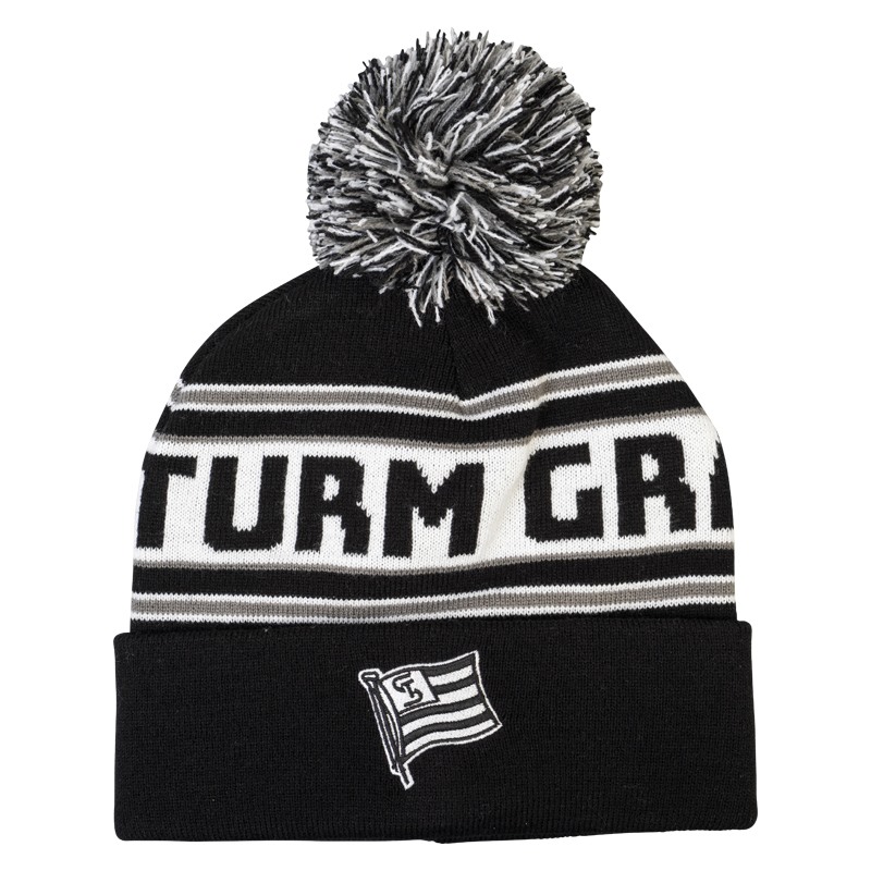 Coole Bommelmütze mit Sturm Graz Schriftzug und aufgestickter Sturm-Fahne. Perfekt für eisige Temperaturen im Stadion.