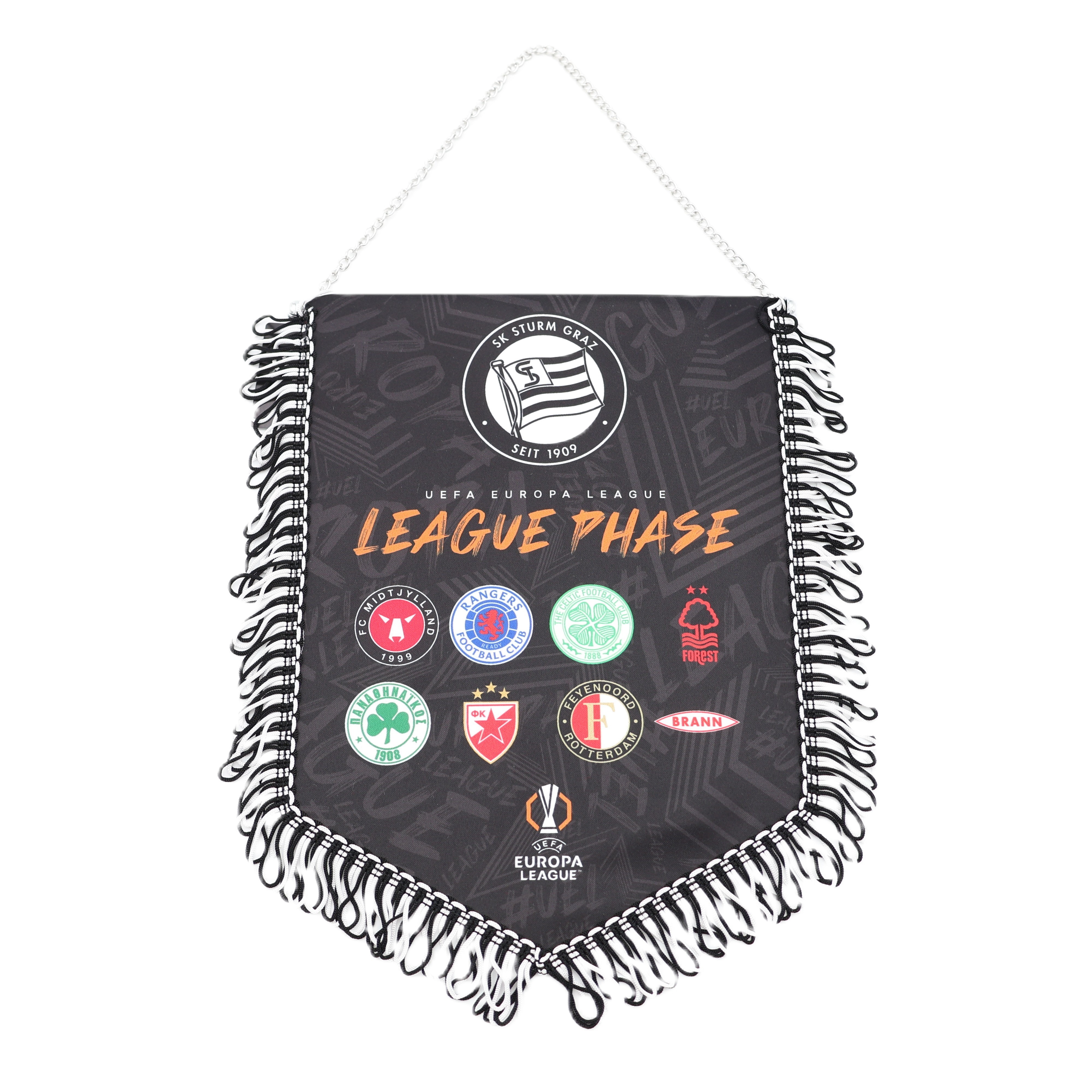 Der offizielle Europa League Gruppenphasen-Wimpel von SK Sturm Graz ist das perfekte Sammlerstück für echte Fans. Mit den Logos aller Gruppengegner und hochwertiger Verarbeitung wird dieser Wimpel zum Highlight an Deiner Wand, im Büro oder im Fanraum.
