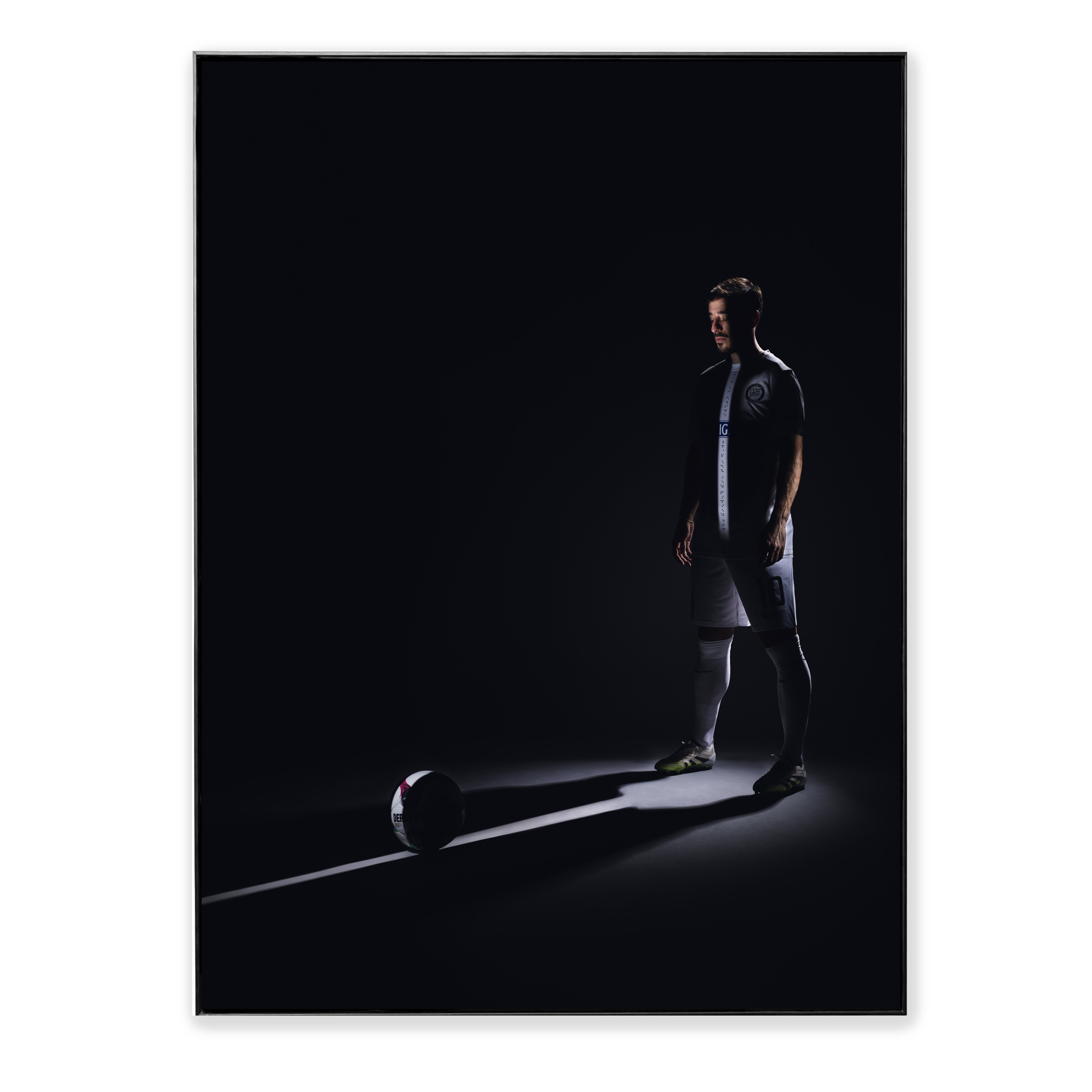 Sein eigener Schatten fällt lang vor ihn, die Last und die Erwartung. Doch inmitten dieser Spannung bleibt ein Detail unerschütterlich: Ein schmaler, klarer Lichtstrahl fällt präzise auf den Ball. Er ist wie eine fixe Vorgabe, eine Gewissheit, die die Flugbahn bereits vorzeichnet.