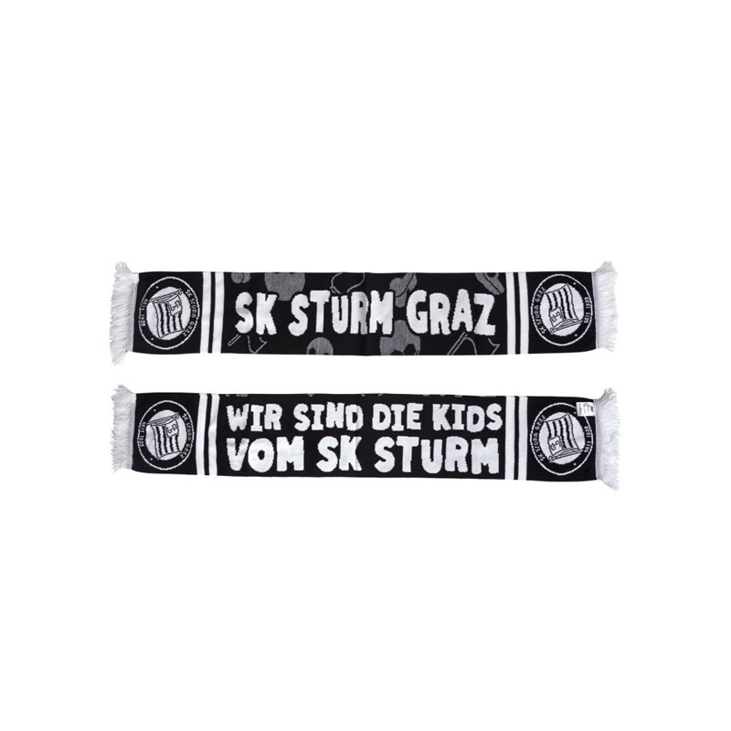 Kinderschal mit SK Sturm Graz Schriftzug auf der Vorderseite und Wir sind die Kids vom SK Sturm Schriftzug auf der Rückseite.