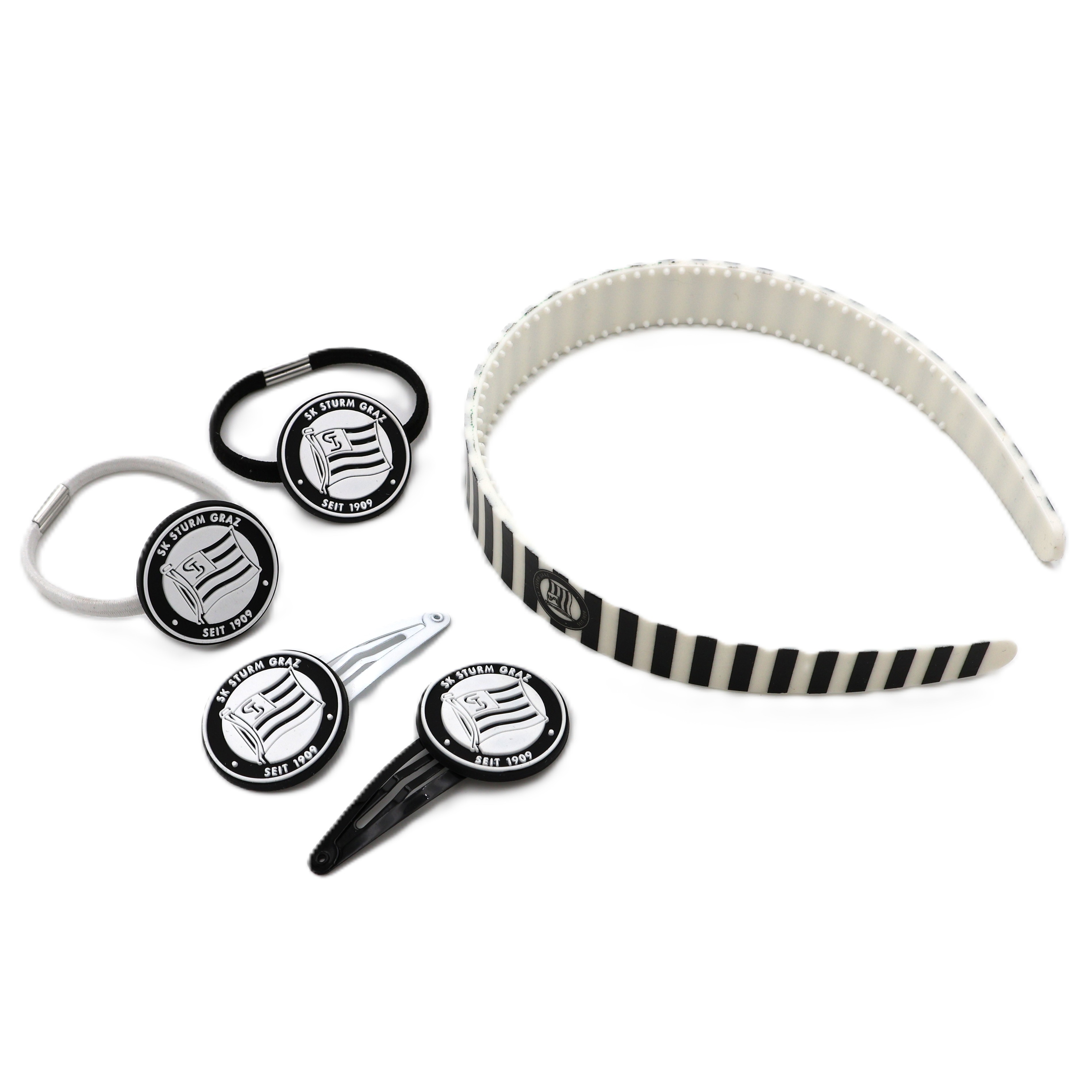 🖤⚽ Fan durch und durch - mit dem 5-teiligen Haarset sitzt der Look auch bei Verlängerung und Jubelsprüngen perfekt. 2 Haarspangen, 2 Haargummis und 1 Haarreif zeigen, für wen Dein Herz schlägt!