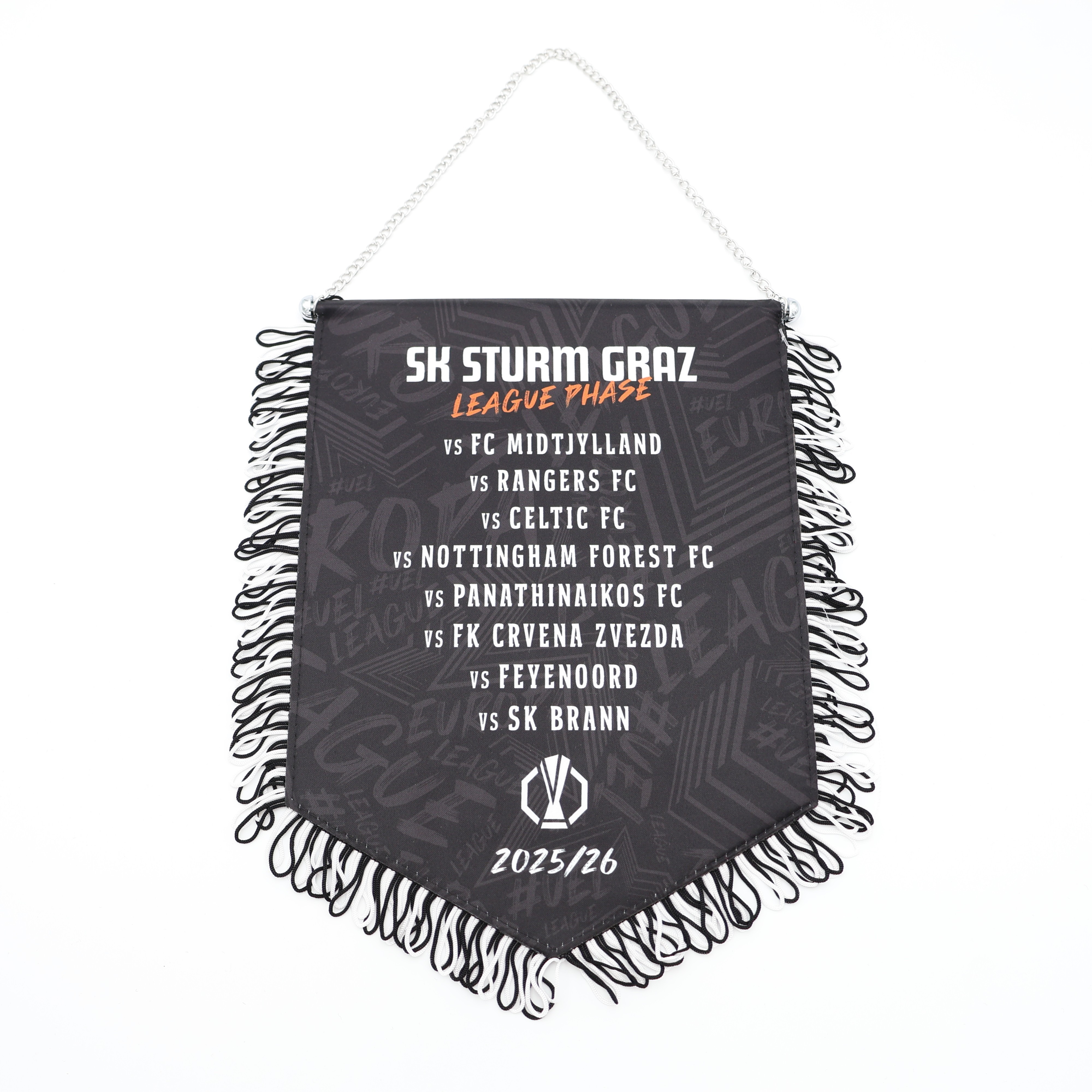 Der offizielle Europa League Gruppenphasen-Wimpel von SK Sturm Graz ist das perfekte Sammlerstück für echte Fans. Mit den Logos aller Gruppengegner und hochwertiger Verarbeitung wird dieser Wimpel zum Highlight an Deiner Wand, im Büro oder im Fanraum.