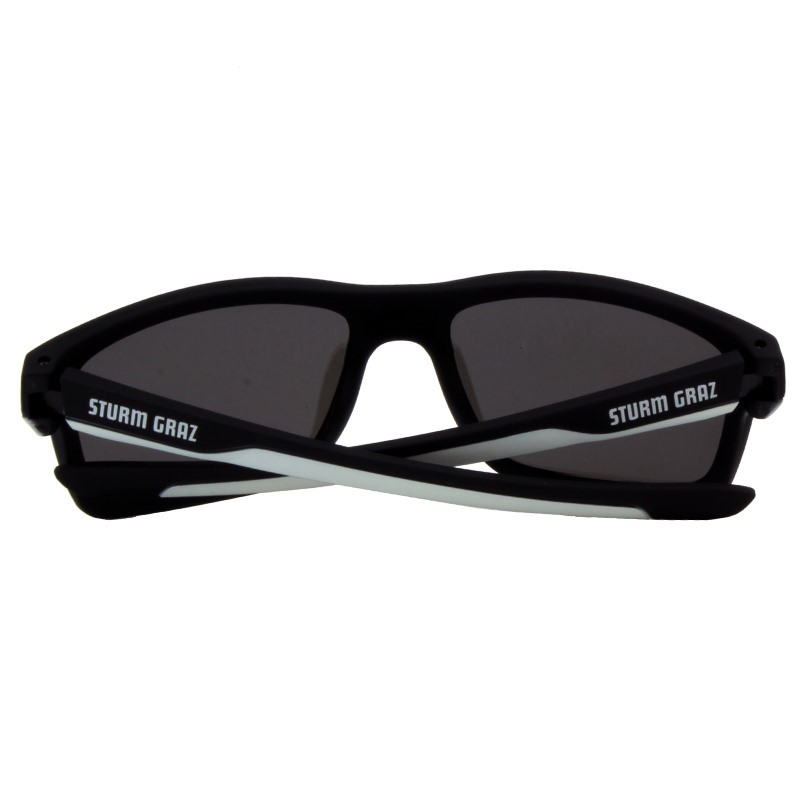 Stabile Sonnenbrille mit matt gummierter Oberfläche und verspiegelten Gläsern. Der Sturm Graz Schriftzug und die dezenten weißen Streifen an den Bügeln verleihen ihr einen sportlichen Look.