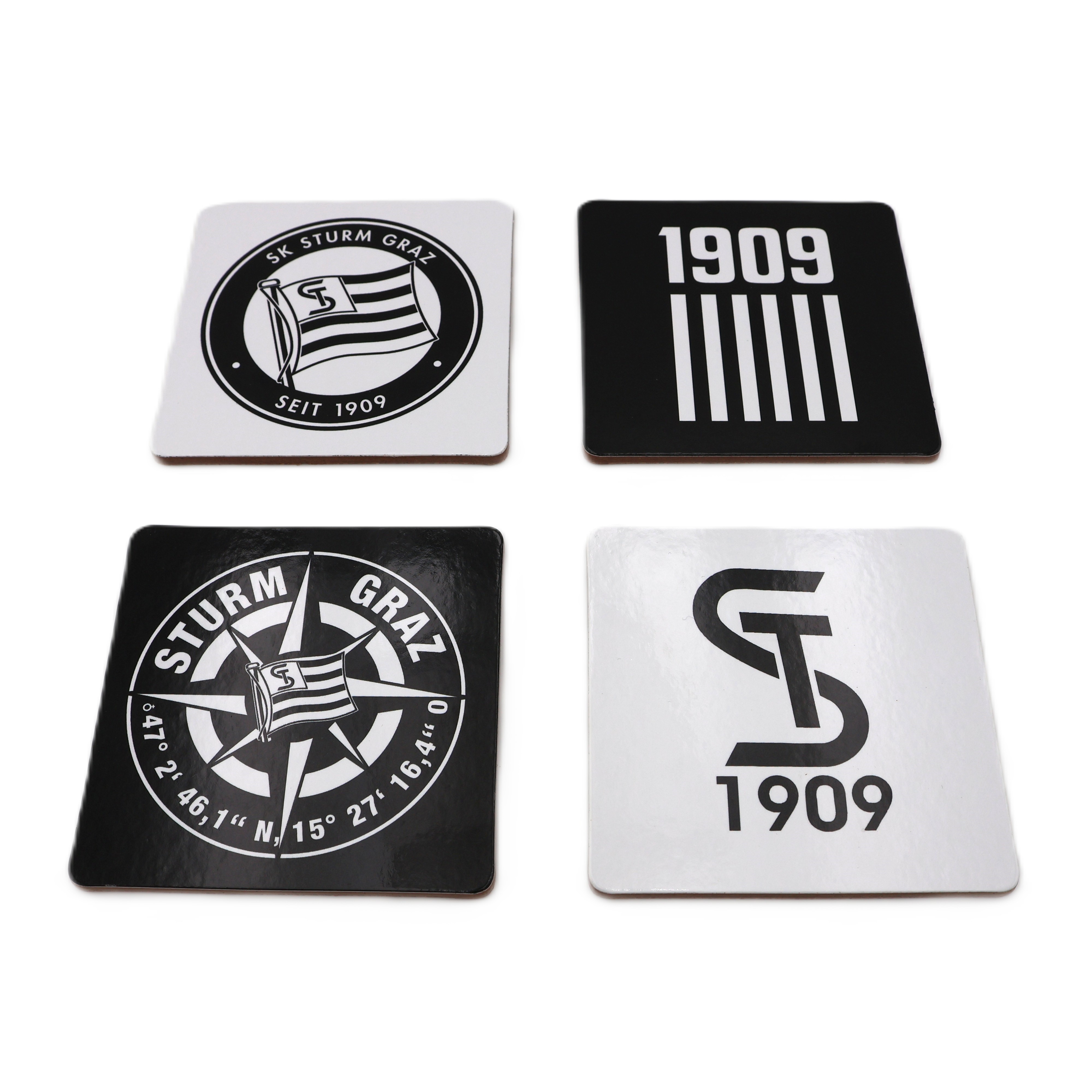 Vier robuste Korkuntersetzer mit den Logos SK Sturm, Urban Stripes, Black Home und ST 1909.